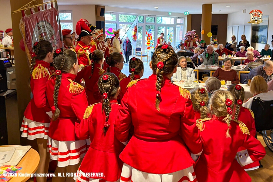 25 Samstags Tour, 7. Februar - Mittags begann unsere Tour, insgesamt 7 Auftritte, im Hewag Seniorenstift an der Karl-Jarres-Straße. Es folgte dann im Karl Martin Haus bei den Jungschützen, begleitet von unserer Minigarde, der nächste Termin. Nach sportlichen Stop dann beim OSC in Rheinhausen ging es zur Mädchensitzung von Rot-Weiß Hamborn-Marxloh. Von dort in die City, einmal zur die Galasitzung der Bürgergarde im WYNDHAM Hotel und dann die Damensitzung vom Sonnigen Süden. Zum Schluss war dann noch das Kostümfest der „Hippen“ in Großenbaum.