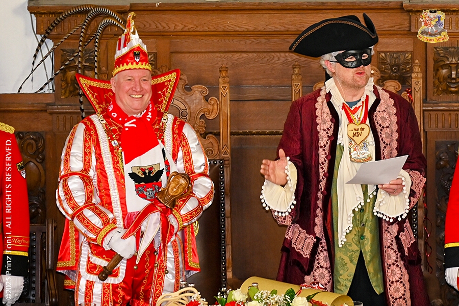 21 Rosenmontag 2026 - Es war eigentlich ein toller Tag, wenn nur das Wetter mitgespielt hätte. Beim Wecken von Prinz Toni I. vor dem WYNDHAM Hotel Duisburger Hof war es schon recht ungemütlich. Danach dann ein paar warme Stunden in unserem Rat, beim Prinzenwecken mit OB Sören Link. Pünktlich zum Start des Rosenmontagszugs geht es los mit dem Regen, bis auf kurze Momente hielt er an bis zum Ende des Zuges. Nachdem sich Alle im König Pilsener Festzelt auf gewärmt hatten, kamen auf der Bühne die Verabschiedung von uns, der Kinderprinzencrew 2026, und Prinz Toni I.