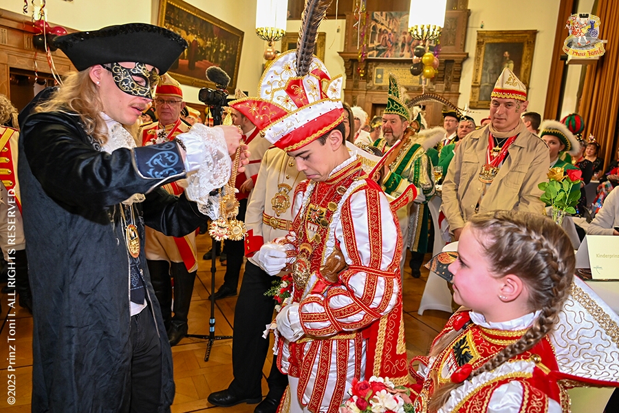 26 Rosenmontag 2026 - Es war eigentlich ein toller Tag, wenn nur das Wetter mitgespielt hätte. Beim Wecken von Prinz Toni I. vor dem WYNDHAM Hotel Duisburger Hof war es schon recht ungemütlich. Danach dann ein paar warme Stunden in unserem Rat, beim Prinzenwecken mit OB Sören Link. Pünktlich zum Start des Rosenmontagszugs geht es los mit dem Regen, bis auf kurze Momente hielt er an bis zum Ende des Zuges. Nachdem sich Alle im König Pilsener Festzelt auf gewärmt hatten, kamen auf der Bühne die Verabschiedung von uns, der Kinderprinzencrew 2026, und Prinz Toni I.
