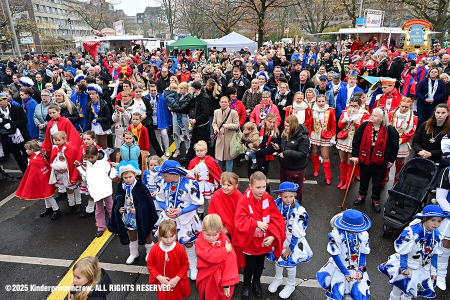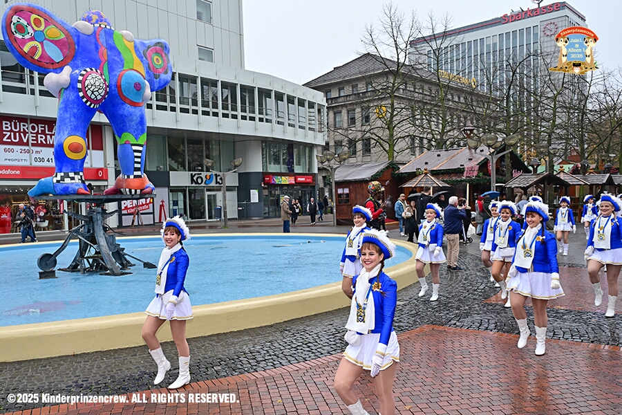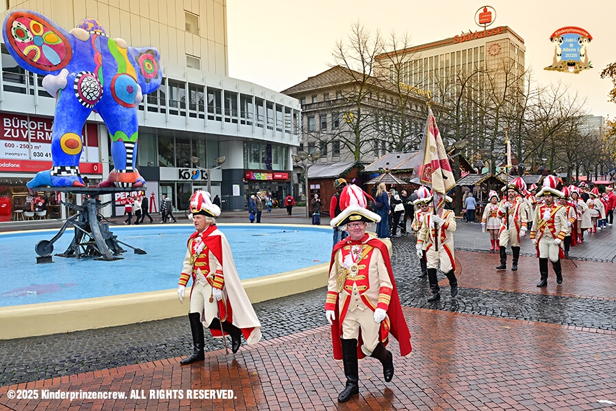 105 Auftakt HDK, Proklamation, Auftaktsitzung - Samstag, 15. November, zogen wir mit den Duisburger Karnevalsgesellschaften vom Forum über die Königsstraße zum Burgplatz. Hier war dann die Auftaktveranstaltung des HDK. Um die Mittagszeit sind es über den Rhein nach Kamp-Lintfort gefahren, dort war in der Stadthalle die Proklamation von der Jugendprinzessin Sophie I. Am frühen Abend dann in die Aula, unsere Aula, vom Reinhard-und-Max-Mannesmann-Gymnasium, zur Auftaktsitzung unseres „Heimathafens“. Mit „stürmischer“ Begeisterung wurden wir dort empfangen.