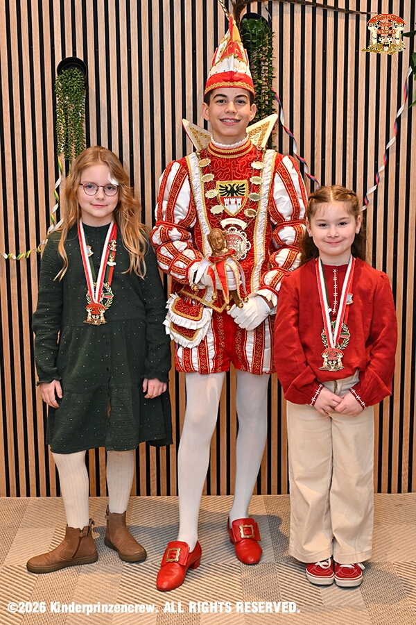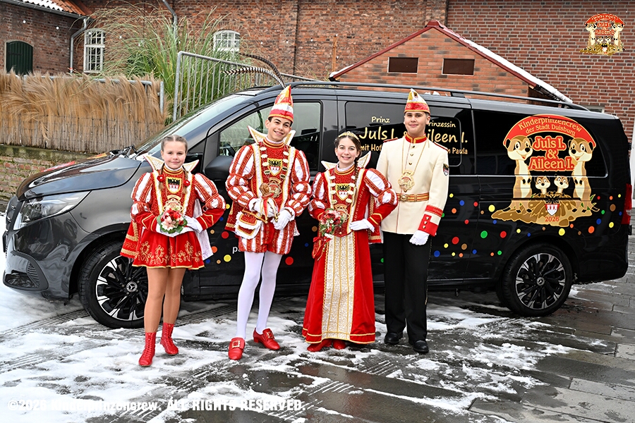 99 Unsere Kürung - Premiere - Im so genannten „Gürzenich“ von Duisburg, dem Steinhof in Huckingen fand am Sonntag, 4. Januar 2026, zum ersten Mal die Kürung einer Kinderprinzencrew statt. Wir sind nun als Prinz Juls I., Prinzessin Aileen I. mit Hofmarschall Sami und Pagin Paula der Stadt Duisburg 2026 inthronisiert.