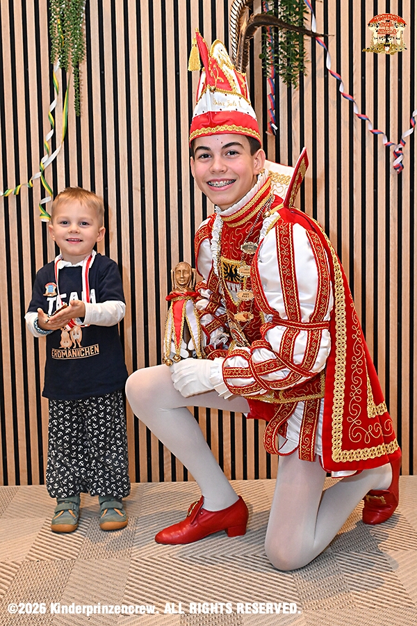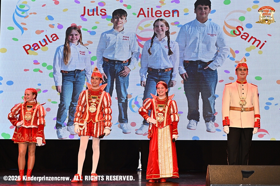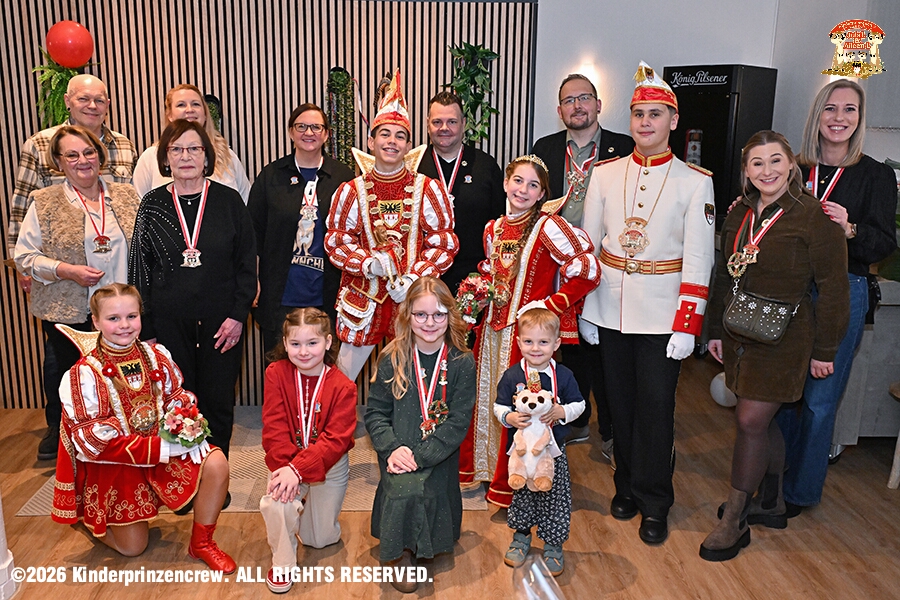 100 Unsere Kürung - Premiere - Im so genannten „Gürzenich“ von Duisburg, dem Steinhof in Huckingen fand am Sonntag, 4. Januar 2026, zum ersten Mal die Kürung einer Kinderprinzencrew statt. Wir sind nun als Prinz Juls I., Prinzessin Aileen I. mit Hofmarschall Sami und Pagin Paula der Stadt Duisburg 2026 inthronisiert.