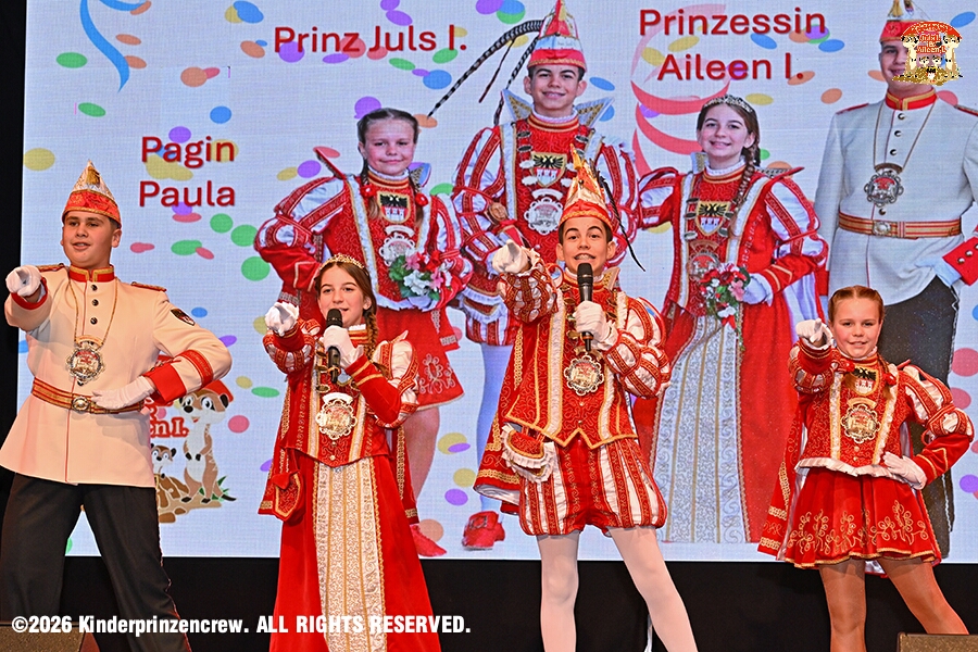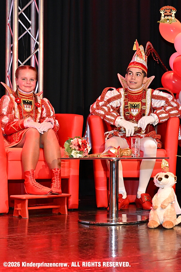 42 Unsere Kürung - Premiere - Im so genannten „Gürzenich“ von Duisburg, dem Steinhof in Huckingen fand am Sonntag, 4. Januar 2026, zum ersten Mal die Kürung einer Kinderprinzencrew statt. Wir sind nun als Prinz Juls I., Prinzessin Aileen I. mit Hofmarschall Sami und Pagin Paula der Stadt Duisburg 2026 inthronisiert.
