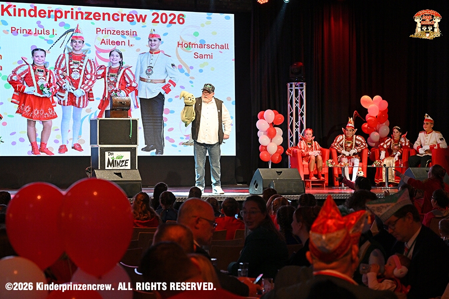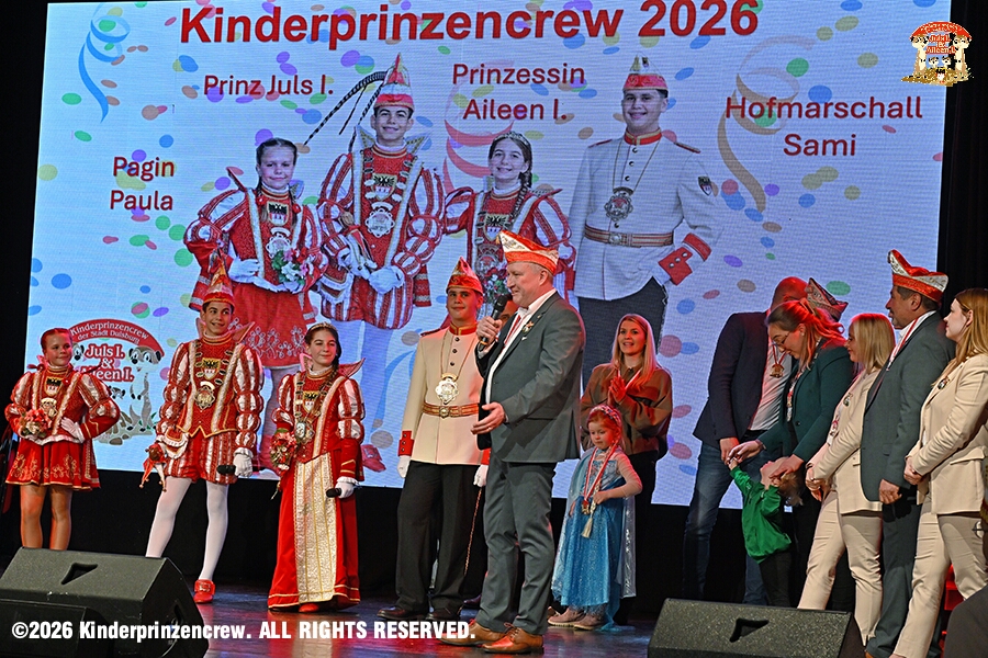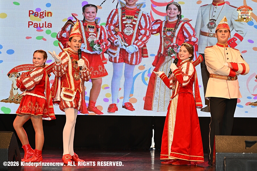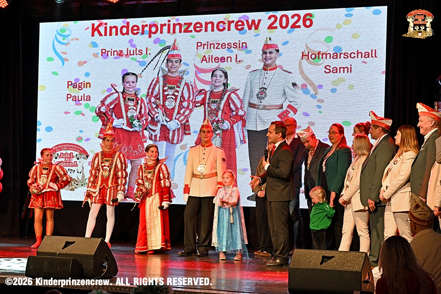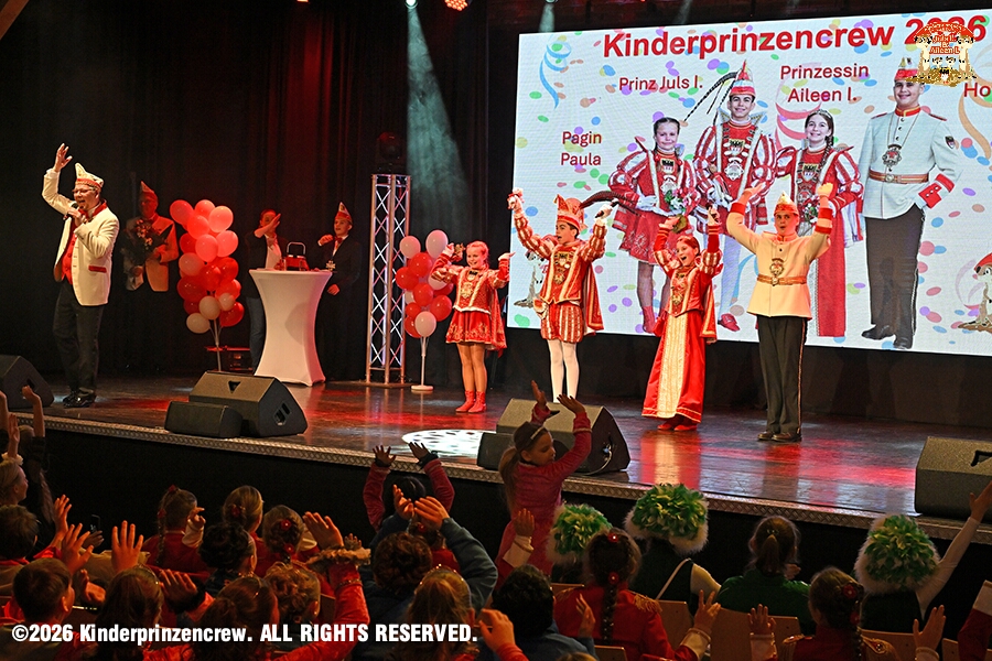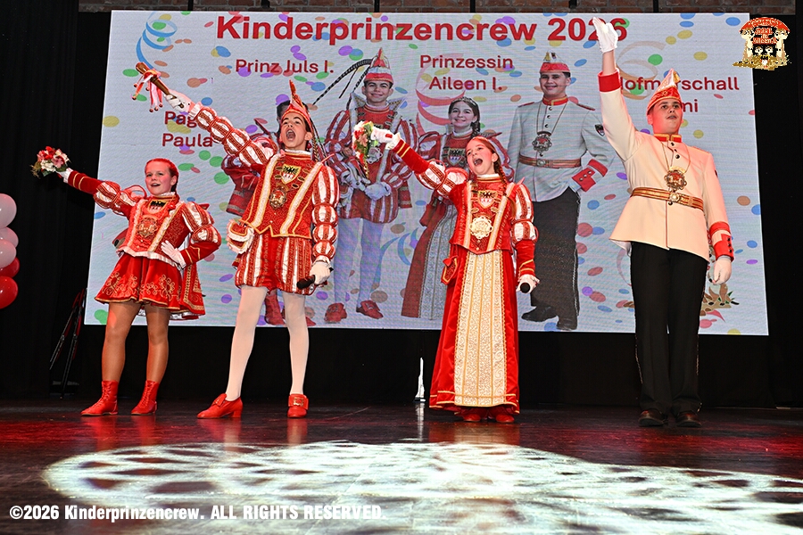116 Unsere Kürung - Premiere - Im so genannten „Gürzenich“ von Duisburg, dem Steinhof in Huckingen fand am Sonntag, 4. Januar 2026, zum ersten Mal die Kürung einer Kinderprinzencrew statt. Wir sind nun als Prinz Juls I., Prinzessin Aileen I. mit Hofmarschall Sami und Pagin Paula der Stadt Duisburg 2026 inthronisiert.
