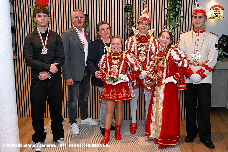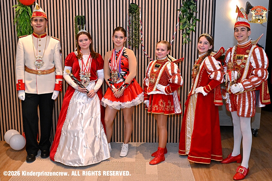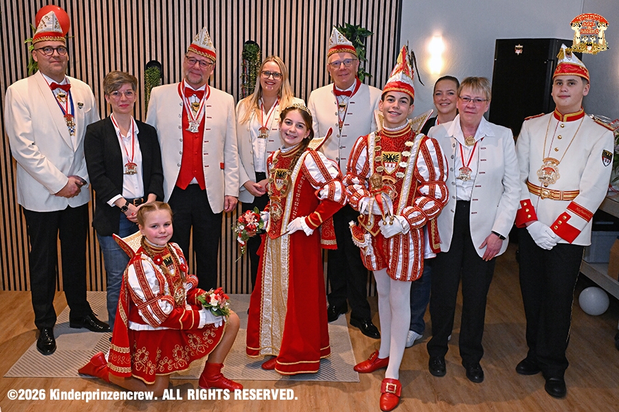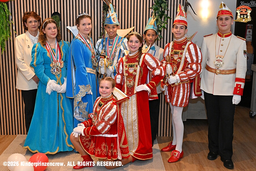 76 Unsere Kürung - Premiere - Im so genannten „Gürzenich“ von Duisburg, dem Steinhof in Huckingen fand am Sonntag, 4. Januar 2026, zum ersten Mal die Kürung einer Kinderprinzencrew statt. Wir sind nun als Prinz Juls I., Prinzessin Aileen I. mit Hofmarschall Sami und Pagin Paula der Stadt Duisburg 2026 inthronisiert.