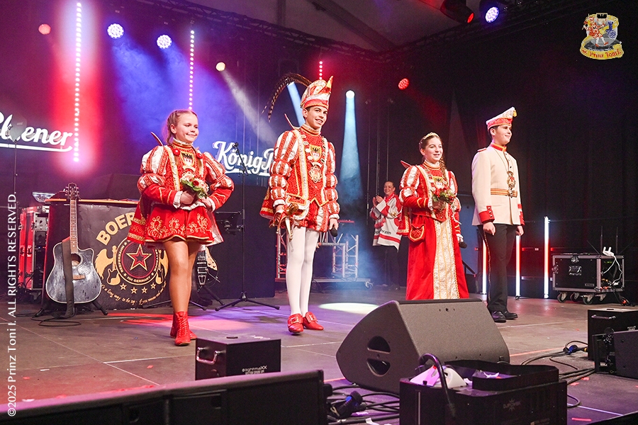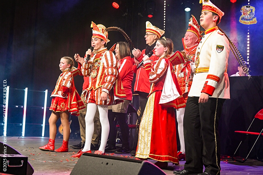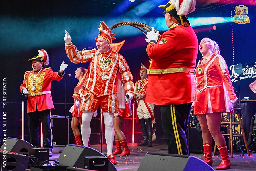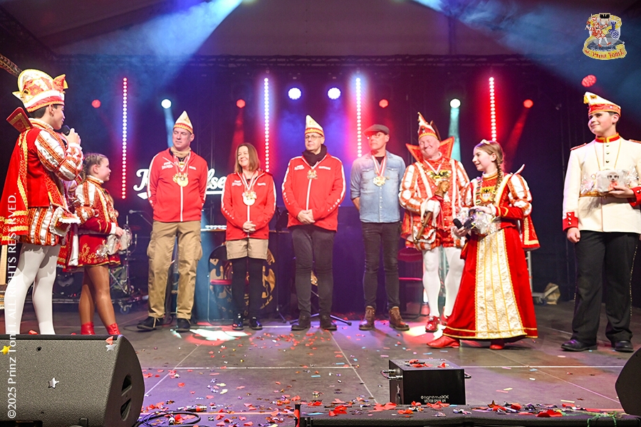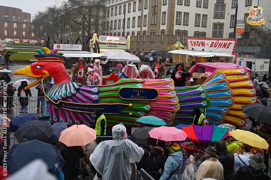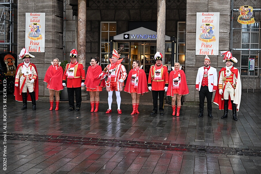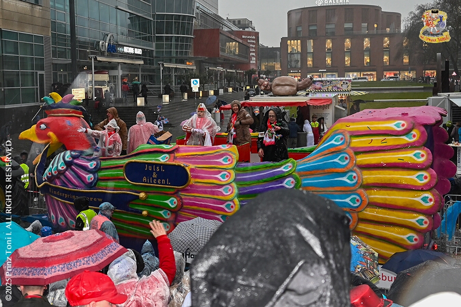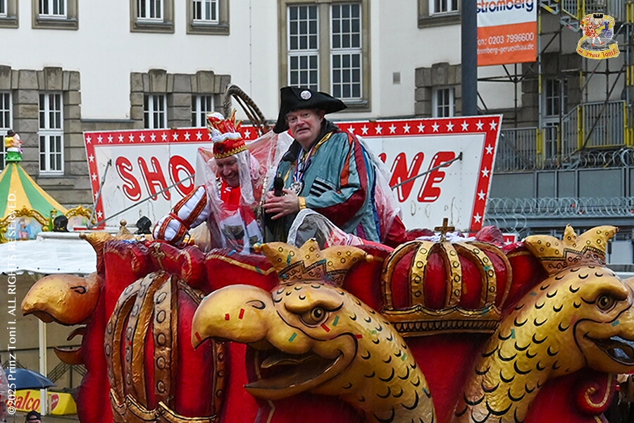 25 Rosenmontag 2026 - Es war eigentlich ein toller Tag, wenn nur das Wetter mitgespielt hätte. Beim Wecken von Prinz Toni I. vor dem WYNDHAM Hotel Duisburger Hof war es schon recht ungemütlich. Danach dann ein paar warme Stunden in unserem Rat, beim Prinzenwecken mit OB Sören Link. Pünktlich zum Start des Rosenmontagszugs geht es los mit dem Regen, bis auf kurze Momente hielt er an bis zum Ende des Zuges. Nachdem sich Alle im König Pilsener Festzelt auf gewärmt hatten, kamen auf der Bühne die Verabschiedung von uns, der Kinderprinzencrew 2026, und Prinz Toni I.