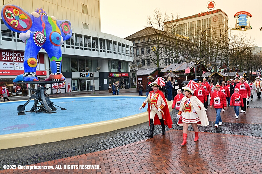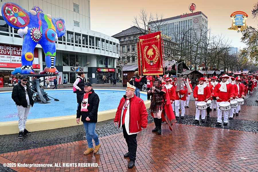 106 Auftakt HDK, Proklamation, Auftaktsitzung - Samstag, 15. November, zogen wir mit den Duisburger Karnevalsgesellschaften vom Forum über die Königsstraße zum Burgplatz. Hier war dann die Auftaktveranstaltung des HDK. Um die Mittagszeit sind es über den Rhein nach Kamp-Lintfort gefahren, dort war in der Stadthalle die Proklamation von der Jugendprinzessin Sophie I. Am frühen Abend dann in die Aula, unsere Aula, vom Reinhard-und-Max-Mannesmann-Gymnasium, zur Auftaktsitzung unseres „Heimathafens“. Mit „stürmischer“ Begeisterung wurden wir dort empfangen.