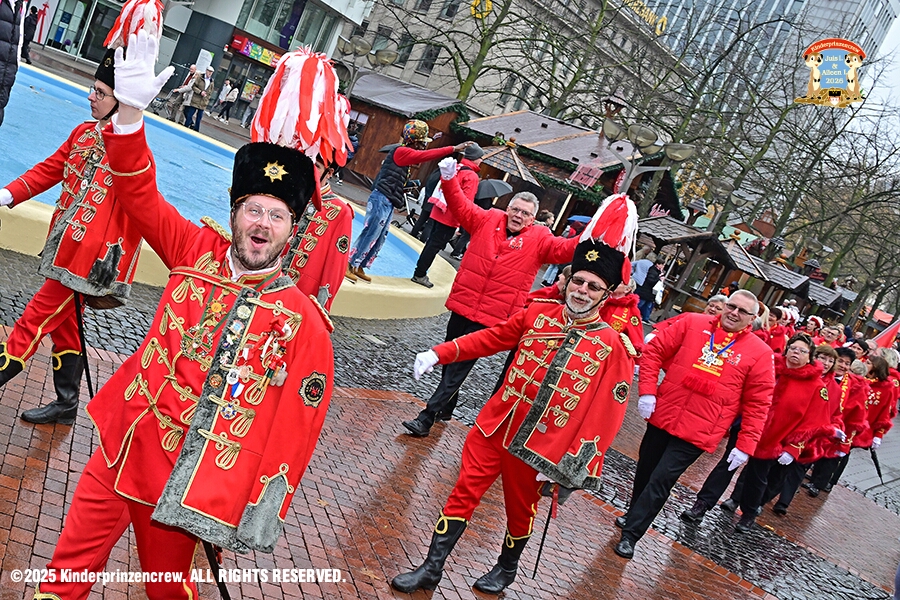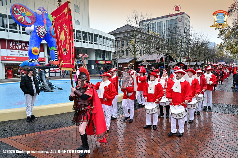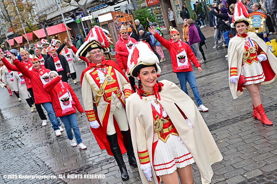 80 Auftakt HDK, Proklamation, Auftaktsitzung - Samstag, 15. November, zogen wir mit den Duisburger Karnevalsgesellschaften vom Forum über die Königsstraße zum Burgplatz. Hier war dann die Auftaktveranstaltung des HDK. Um die Mittagszeit sind es über den Rhein nach Kamp-Lintfort gefahren, dort war in der Stadthalle die Proklamation von der Jugendprinzessin Sophie I. Am frühen Abend dann in die Aula, unsere Aula, vom Reinhard-und-Max-Mannesmann-Gymnasium, zur Auftaktsitzung unseres „Heimathafens“. Mit „stürmischer“ Begeisterung wurden wir dort empfangen.