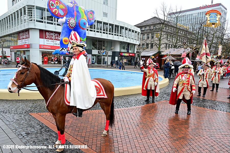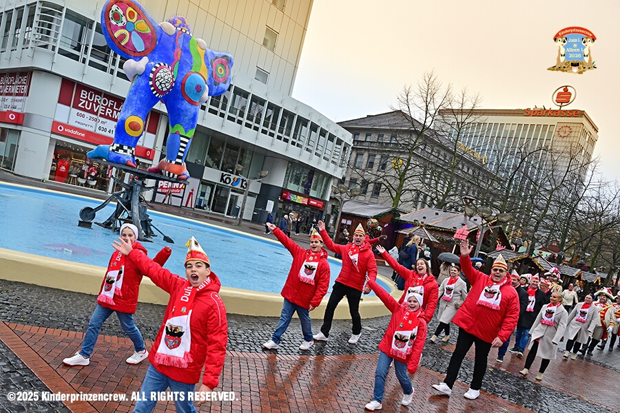 4 Auftakt HDK, Proklamation, Auftaktsitzung - Samstag, 15. November, zogen wir mit den Duisburger Karnevalsgesellschaften vom Forum über die Königsstraße zum Burgplatz. Hier war dann die Auftaktveranstaltung des HDK. Um die Mittagszeit sind es über den Rhein nach Kamp-Lintfort gefahren, dort war in der Stadthalle die Proklamation von der Jugendprinzessin Sophie I. Am frühen Abend dann in die Aula, unsere Aula, vom Reinhard-und-Max-Mannesmann-Gymnasium, zur Auftaktsitzung unseres „Heimathafens“. Mit „stürmischer“ Begeisterung wurden wir dort empfangen.