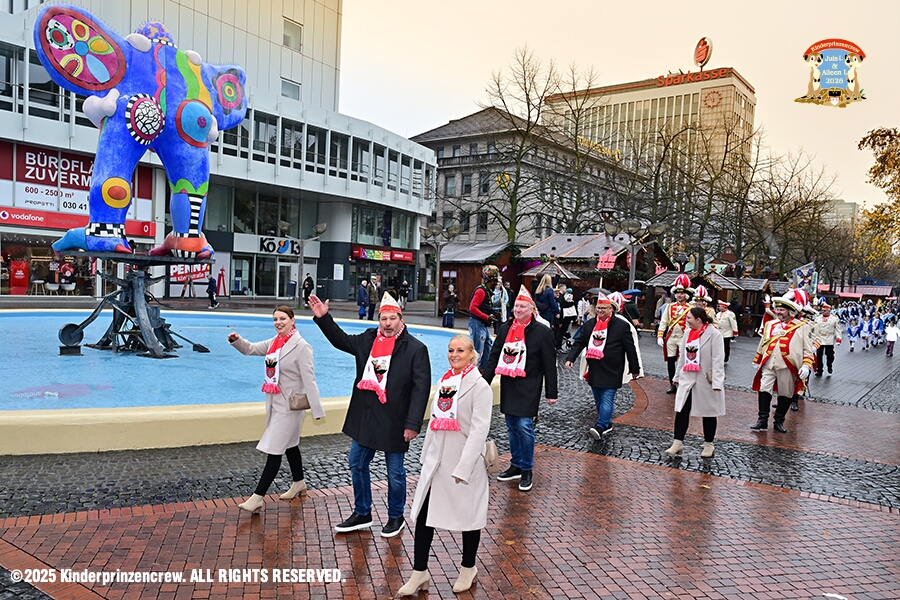 2 Auftakt HDK, Proklamation, Auftaktsitzung - Samstag, 15. November, zogen wir mit den Duisburger Karnevalsgesellschaften vom Forum über die Königsstraße zum Burgplatz. Hier war dann die Auftaktveranstaltung des HDK. Um die Mittagszeit sind es über den Rhein nach Kamp-Lintfort gefahren, dort war in der Stadthalle die Proklamation von der Jugendprinzessin Sophie I. Am frühen Abend dann in die Aula, unsere Aula, vom Reinhard-und-Max-Mannesmann-Gymnasium, zur Auftaktsitzung unseres „Heimathafens“. Mit „stürmischer“ Begeisterung wurden wir dort empfangen.